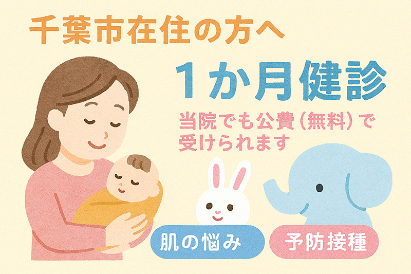当院では、1か月健診(千葉市の無料健診)、1歳未満の乳児健診(千葉県の無料健診)と1歳6か月、3歳の健診(千葉市の無料健診)を行っております。