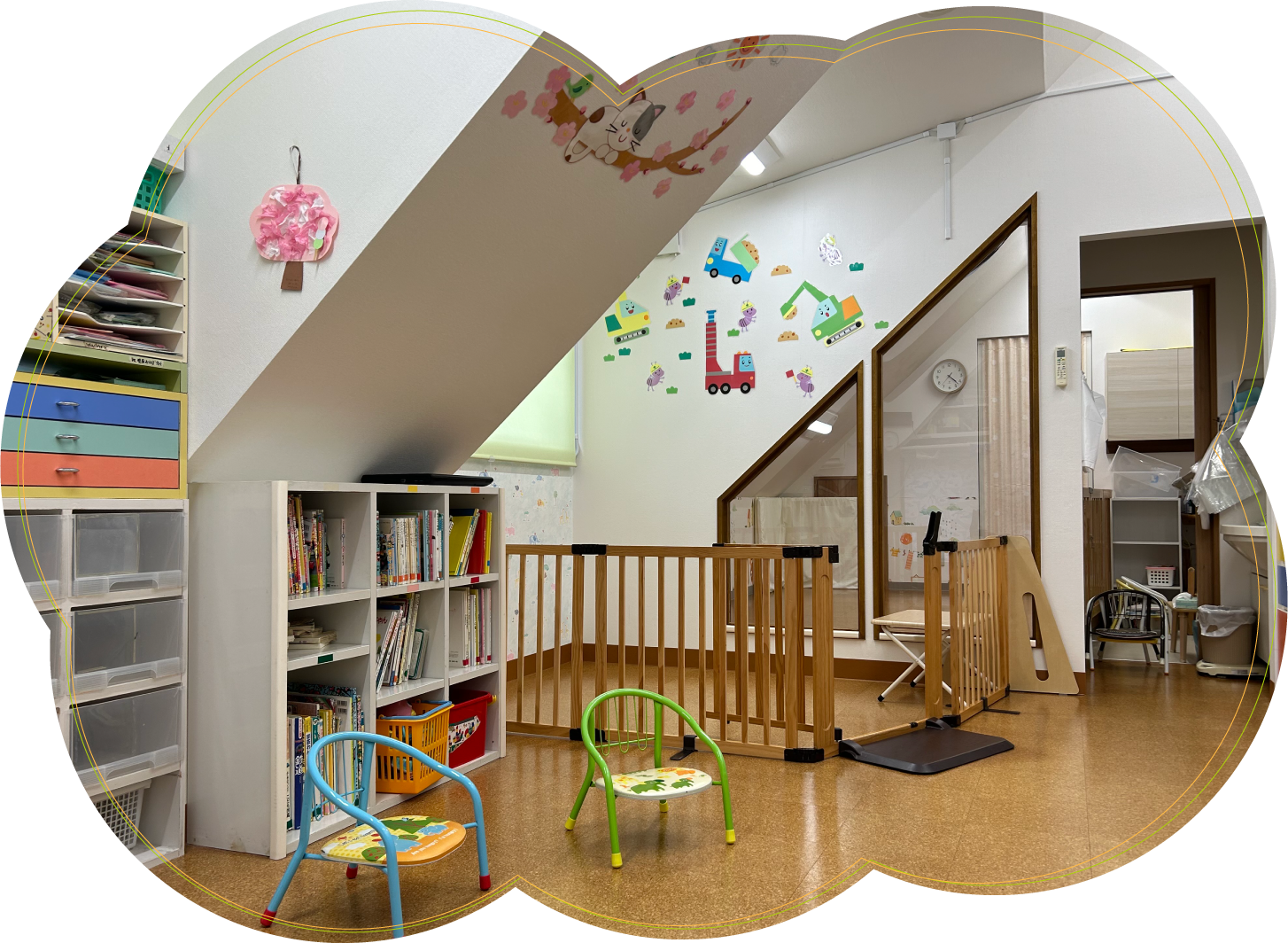1区画が区切られ、隔離室になっています。保育士がその季節にあったかわいらしい飾り付けをしてくれ、とても楽しい部屋になっています。定員は6人の小さな保育室です。