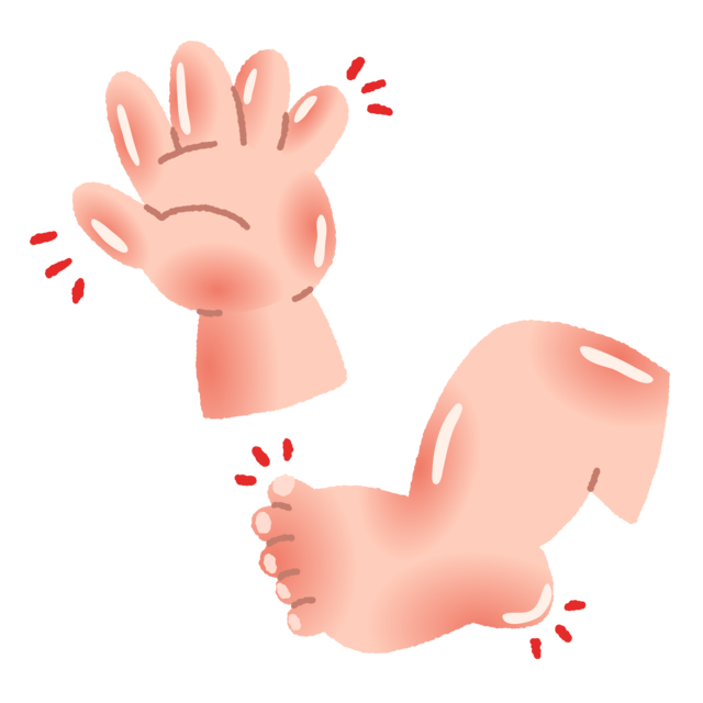 片側だけの手足が腫れている場合、蜂窩織炎などの感染症、打撲や捻挫などの怪我、虫さされなどを考える必要があります。両方の手足が腫れている場合も、蜂窩織炎などの感染症は考えますが、他にも川崎病やIgA血管炎など全身性の病気も考える必要があります。